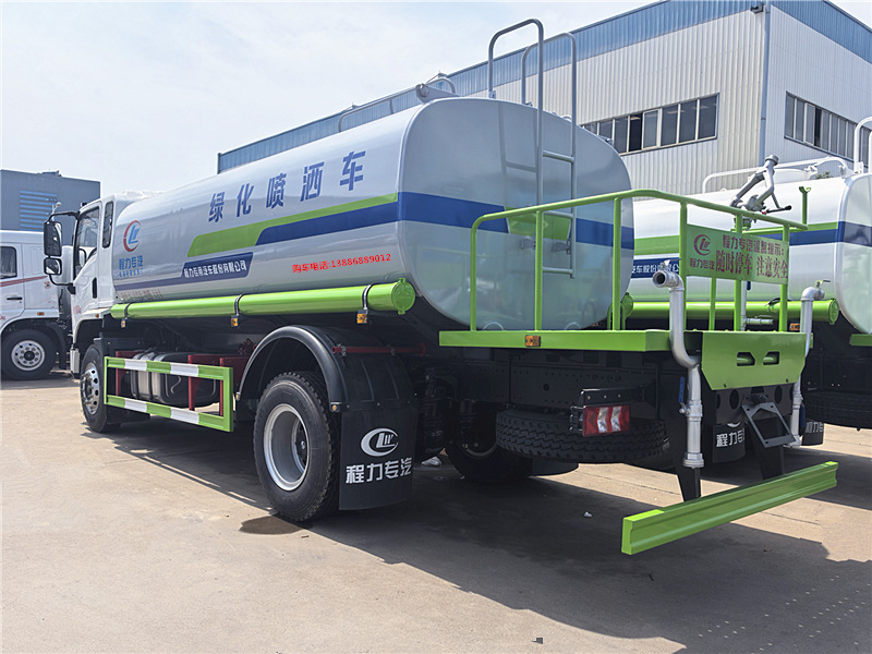 上裝配置:罐體采用國標Q235碳鋼,罐體厚度4mm,前后封頭5MM加厚型,罐體實際容積12-15噸(12-15立方),產品質量成熟可靠,設計先進合理,比同類灑水泵壓力大、吸程遠、使用壽命長,可泵進泵出。前沖、后灑、側噴,消防栓接口,帶后工作平臺及綠化高炮(可全方位旋轉,可連續調成直沖狀、大雨、小雨、毛毛雨),水位計,兩根等長輸水管,其余標配。
